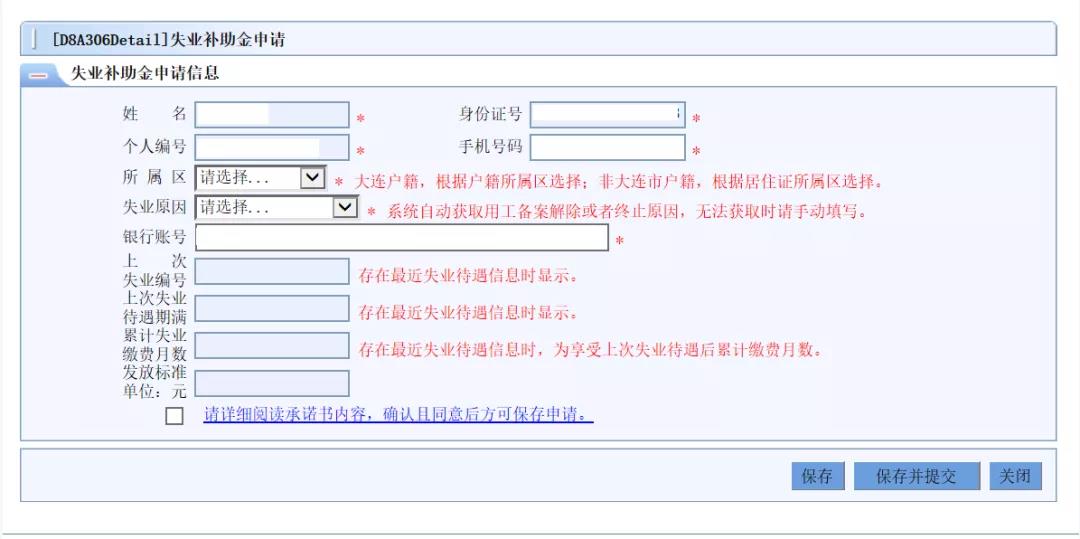 步驟四:點擊失業(yè)補助金申請模塊,系統(tǒng)自動獲取社會保障卡號,錄入個人基本信息(填報信息里帶*號的必填,不帶*號的不用填),簽訂申領失業(yè)補助金承諾書,在確認無誤后按“保存并提交” 鈕上傳申領數(shù)據(jù)。如持有承載失業(yè)保險待遇發(fā)放的八家銀行(工商銀行、農(nóng)業(yè)銀行、中國銀行、建設銀行、交通銀行、大連銀行、郵政儲蓄銀行、農(nóng)商銀行)的社會保障卡,需先到社?òl(fā)卡銀行開通社保卡金融功能(開通后五個工作日后再申請),確保正常領取失業(yè)補助金待遇。如持有其他銀行的社?▌t需錄入大連銀行卡號申領。