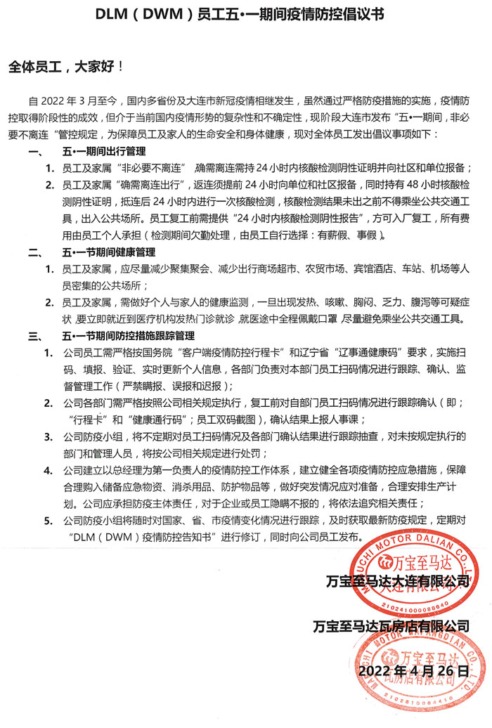《DLM(DWM)“五一”休假期間疫情防控倡議書